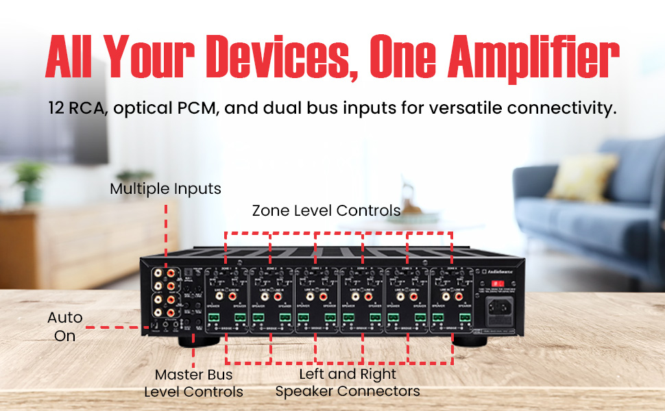 - Flexible Audio Routing – Supports 12 independent inputs and gain controls for each channel. 2 bus inputs and 1 optical PCM input. Input selection and volume are fully adjustable per channel.