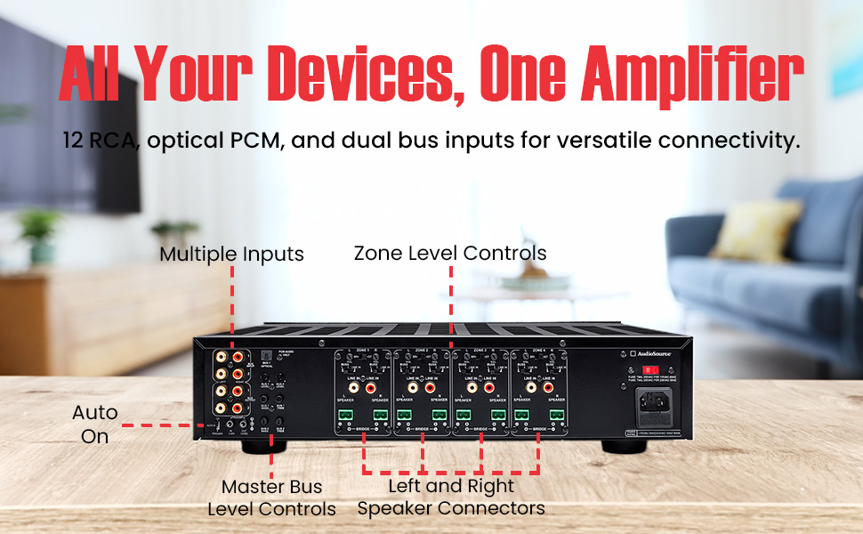 Each channel can select between a dedicated Line In, Bus 1, or Bus 2 input. A dedicated Optical input allows you to connect digital sources in PCM stereo format. Two master-level Bus volume controls, plus treble and bass for each Bus, allow installers to optimize performance room-by-room.