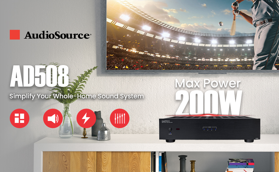 The AudioSource AD508 Digital Multi-Zone Power Amplifier is the ultimate solution for residential and commercial multi-room audio systems. Engineered to power 8 independent channels (4 stereo zones), the AD508 offers rock-solid Class D digital efficiency with 65W per channel at 8 ohms, 100W at 4 ohms, or delivering up to 200W bridged pair into 8 ohms.