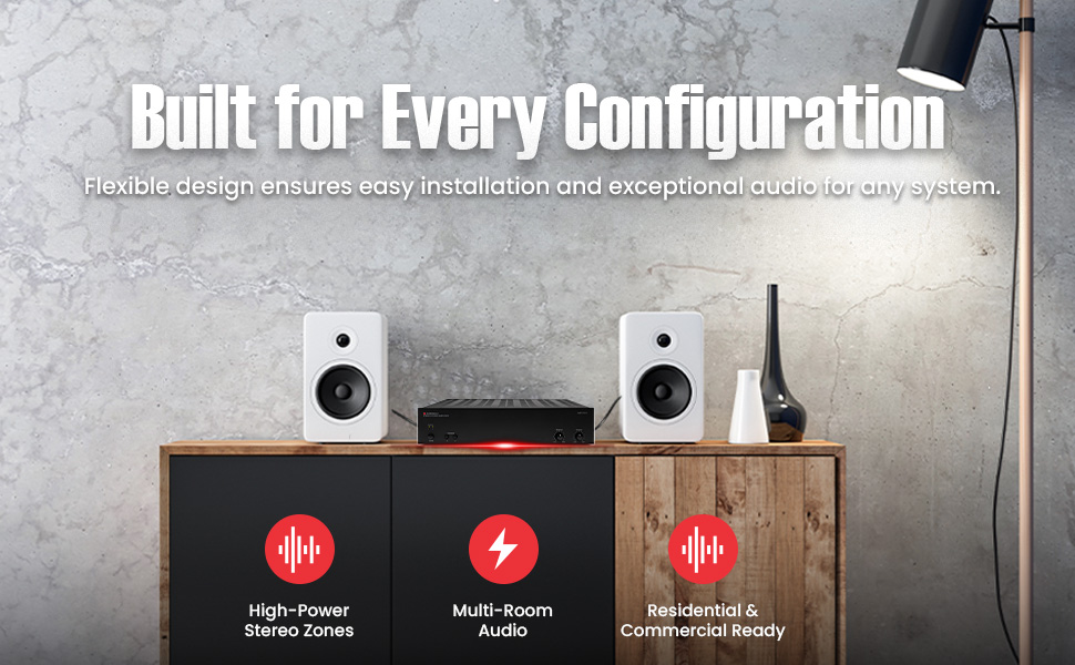 - A/B Zone Control with Trim Options – Dual speaker output zones with front-panel balance and volume trimming. Drive one or two zones independently or together.
