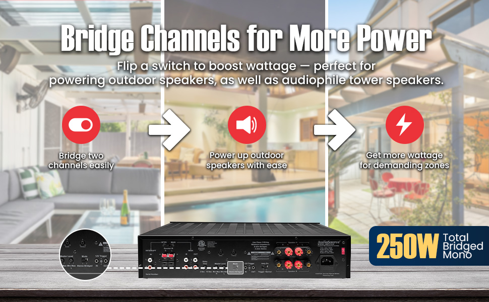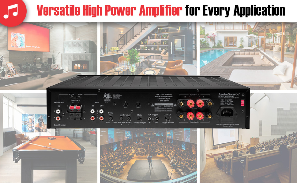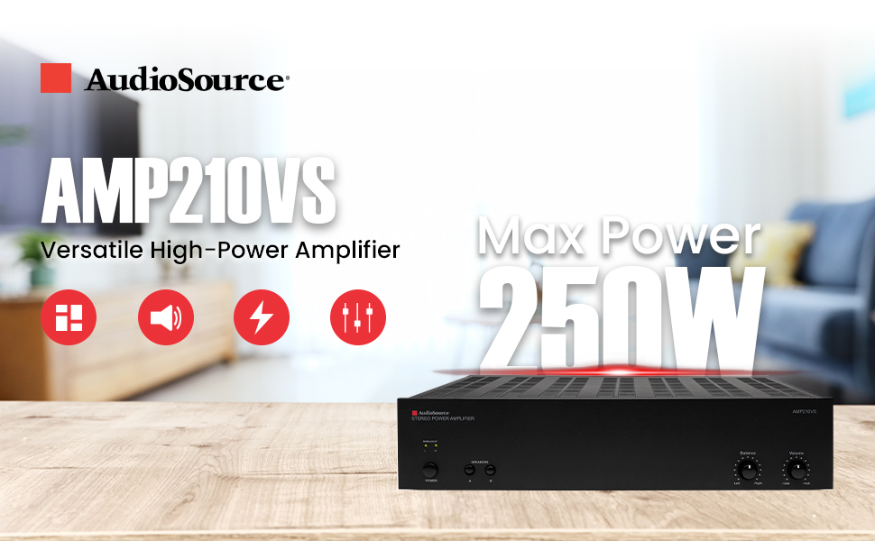 The AudioSource AMP210VS is a high-performance stereo amplifier designed for advanced distributed audio systems, home theaters, or commercial applications requiring flexibility and clarity. Delivering 100 watts per channel at 8 ohms, 125watts at 4 ohms and an impressive 250 watts bridged into 8 ohms. The AudioSource AMP210VS provides reliable Class AB power through triple-Darlington stages for enhanced performance.