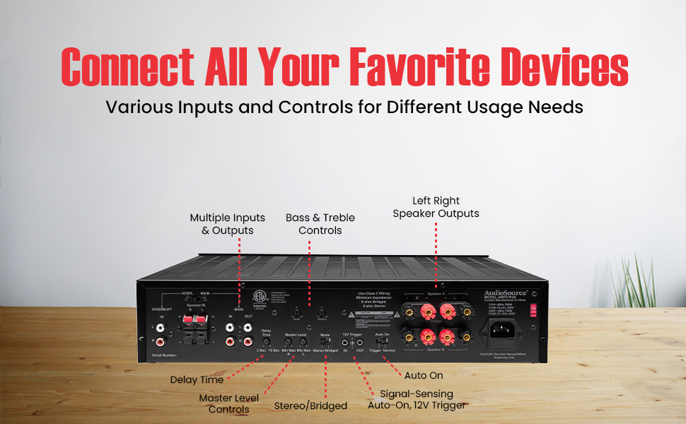 The AudioSource AMP210VS can be used as a zone amp, subwoofer driver, or core power amp in a rack-based audio system. MAIN and INTERRUPT RCA inputs allow flexible source control, with an adjustable delay feature to ensure smooth transitions. Dual speaker zones with A/B switching, high-level speaker input, and precise gain trimming provide installers full flexibility for custom applications.