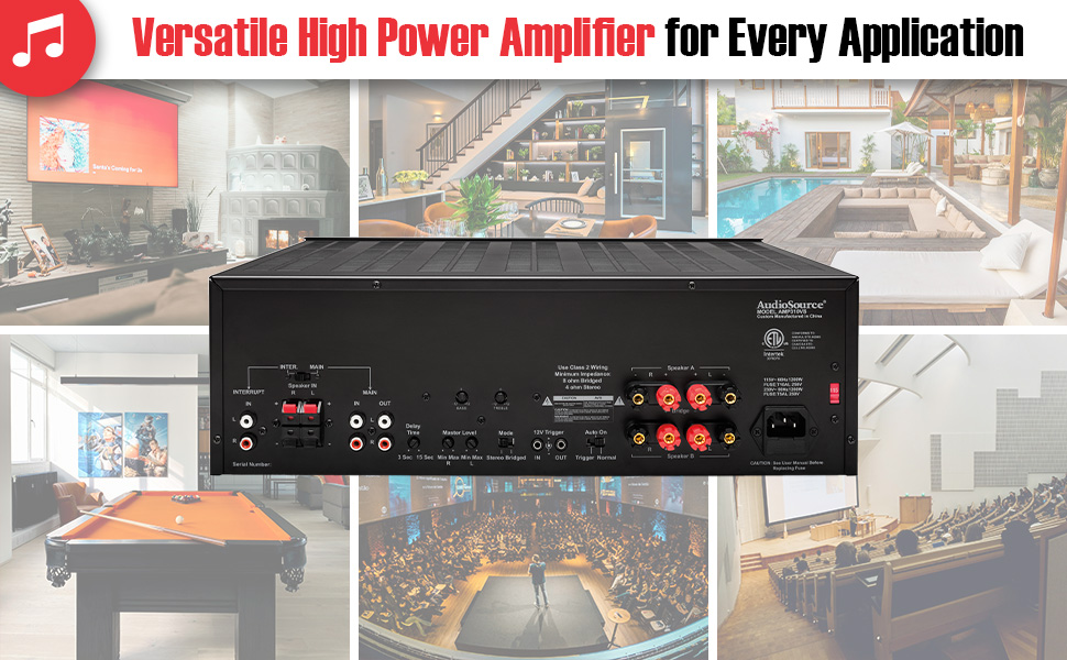 The AudioSource AMP310VS can be used as a zone amp, subwoofer driver, or core power amp in a rack-based audio system. MAIN and INTERRUPT RCA inputs allow flexible source control, with an adjustable delay feature to ensure smooth transitions. Dual speaker zones with A/B switching, high-level speaker input, and precise gain trimming provide installers full flexibility for custom applications.