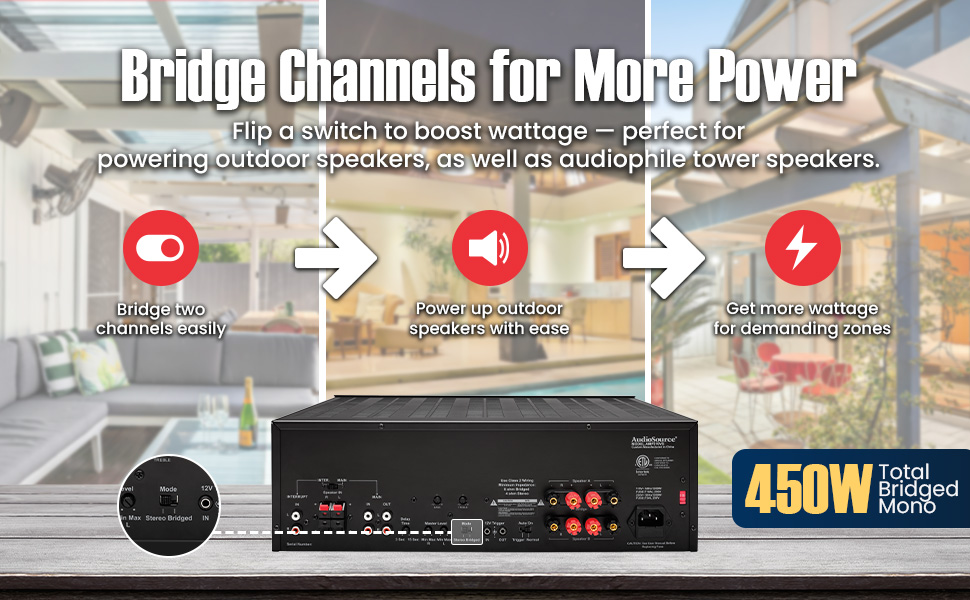 The AudioSource AMP310VS is a high-performance stereo amplifier designed for advanced distributed audio systems, home theaters, or commercial applications requiring flexibility and clarity. Delivering 150 watts per channel into 8 ohms, 225 watts into 4 ohms and an impressive 450 watts bridged into 8 ohms. The AudioSource AMP310VS provides reliable Class AB power through triple-Darlington stages for enhanced performance.