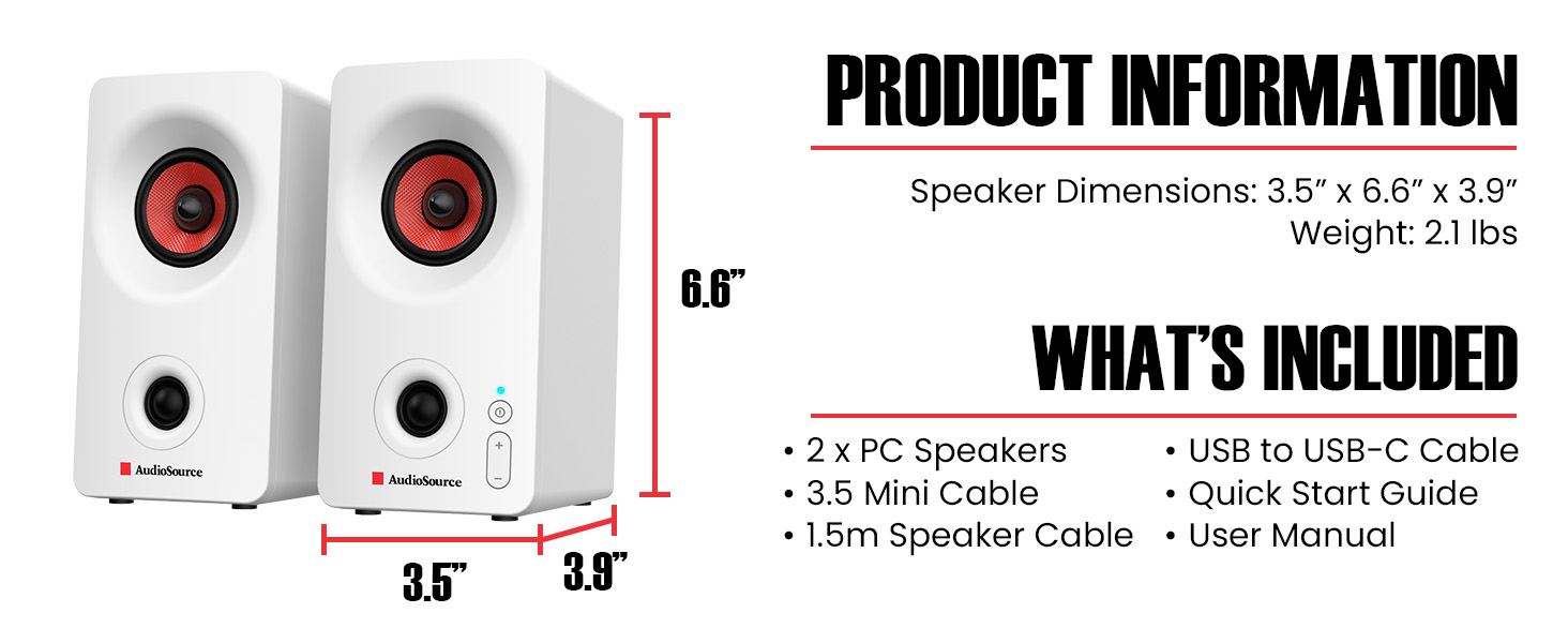 - Compact Size, Clean Design – Designed to fit any desk setup, these PC speakers feature a sleek matte black or white finish, simple LED indicator, and intuitive power and volume controls. At just 3.5″ x 6.6″ x 3.9″, they blend into your workspace while elevating your sound.