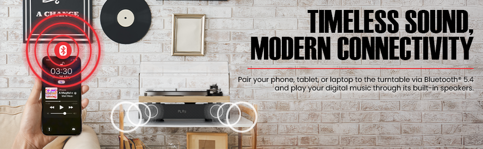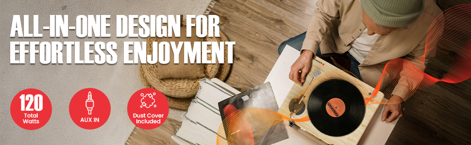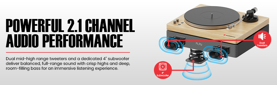 - Vinyl Record Player with Built-In 120W 2.1 Speaker – Enjoy full-range sound from stereo drivers and a dedicated down-firing subwoofer in a ported Bass Reflex design, delivering deep bass and warm vinyl tones – no external speakers or amplified required