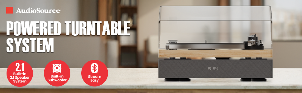 Rediscover the warm, rich sound of vinyl with the AudioSource All-In-One Turntable System. Featuring a belt-driven 2-speed design for 33⅓ and 45 RPM playback, this premium record player combines classic analog performance with modern wireless convenience. The built-in 2.1 stereo speaker system with subwoofer delivers full-bodied sound and deep bass, while Bluetooth connectivity lets you stream music directly from your smartphone. Versatile connections include Aux-In for external devices and RCA outputs to expand your setup with additional speakers or amplifiers. An advanced suspension/isolation system reduces acoustic feedback, ensuring clear, uninterrupted listening whether you’re enjoying vintage LPs or streaming your favorite playlists.