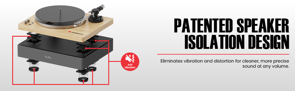 - Patented Speaker Isolation Design – Our innovative design decouples the speaker from your turntable, eliminating acoustic feedback and vibration-induced distortion. Enjoy cleaner, more precise playback even on heavy bass tracks or at higher volumes, preserving both your vinyl and stylus while delivering optimal sound clarity.